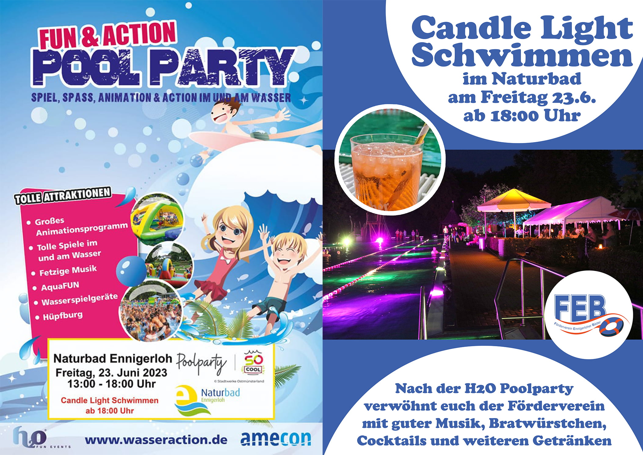 Zum Ferienbeginn wird im Naturbad Ennigerloh einiges geboten. Am Freitag den 23.6. beginnt um 13 Uhr die große H2O Poolparty mit einem großen Programm für Kinder. Coole Musik, ein großes Animationsprogramm, Aquatrack, Hüpfburg und jede Menge Spiele am und im Wasser sind nur einige Highlights für die Kids. Die H2O Poolparty wird von den Stadtwerken Ostenmünsterland gesponsort.