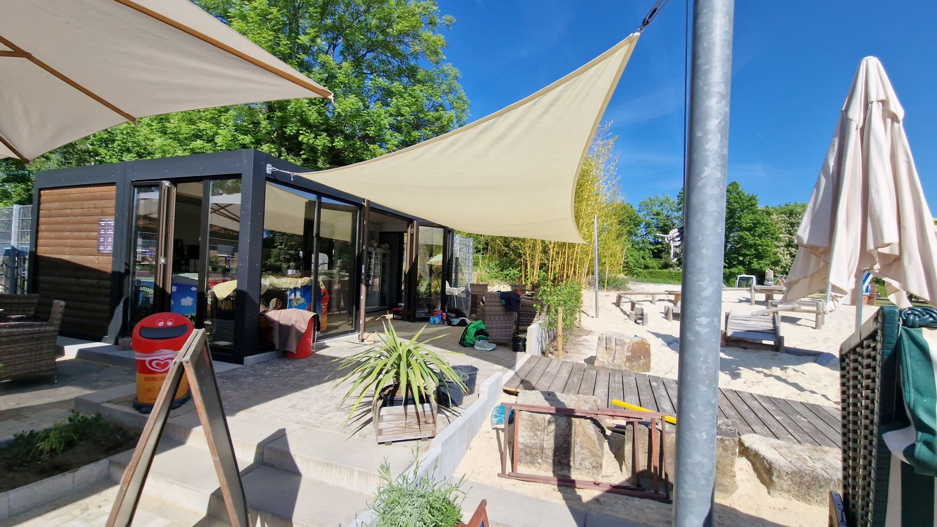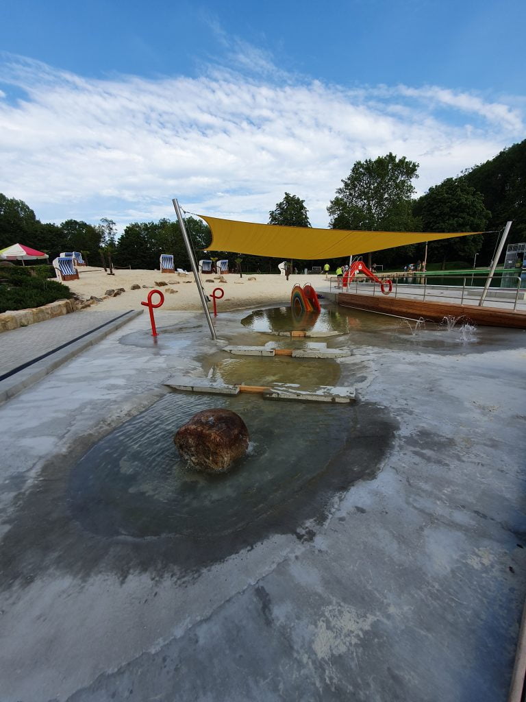 - Kleinkindbereich mit Quellstein, Wasserfontänen und Wasserlauf mit Staustufen und Sandbereich (45 m²)