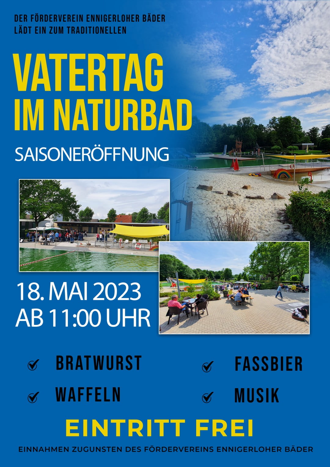 Der Eintritt ins Naturbad ist an diesem Tag frei. Die Vatertags-Veranstaltung beginnt um 11 Uhr. Es gibt Bier vom Fass und natürlich auch weitere Getränke. Der Förderverein hat einen DJ engagiert, der mit Musik für entspannte Stimmung sorgt. Der FEB verwöhnt die Besucher zudem mit frischen Waffeln und Kaffee. Auf Freunde des deftigen Genusses warten leckere Bratwürstchen vom Grill. Natürlich gibt es auch die beliebten Snacks aus dem Kiosk, unter anderem Eis und die guten Freibad-Pommes. Alle Einnahmen kommen dem Förderverein Ennigerloher Bäder zugute.